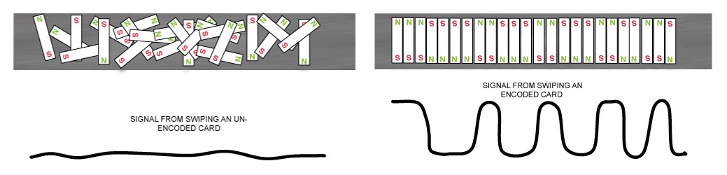 Magnetic stripes are thin layers of ferrous oxide applied to the surface of the card. Each oxide particle has a magnetic north and magnetic south pole. When first applied to the surface of the card, the arrangement of these particles is totally random, the stripe is magnetically neutral and is said to be “un-encoded” or blank. To add information to the magnetic stripe, the oxide particles are forced to align with their magnetic poles in the same direction. By periodically reversing the direction of the alignment this “encoding” creates a pattern of transitions between north south magnetic fields. It is these transitions that are read and interpreted as data.